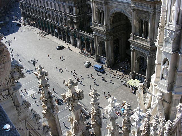 Ha megküzdöttünk a buszjegyért (1 euró), egyenes járat visz a metrómegállóba, ahol a Duomo irányába kell tartani a metróval. Tényleg közvetlen a dóm alatt van a megálló. Nagyon durva volt, mikor felértünk az aluljárónkból, és hirtelen elénk toppant a dóm a főfrontjával, teljes pompájában. A templomba (sem ide, sem akármelyik másikba(!) ) való belépésért nem kellett fizetni. Fel lehet menni lifttel (8 euró) vagy gyalog (5 euró) a székesegyház tetejére. Hatalmas élmény sétálgatni az aprólékosan kifaragott tornyocskák között, meg amúgy sem gyakran sétál az ember házak tetején – hát még templomén.