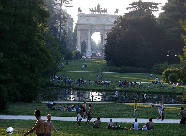 A Dóm mögött van még egy aranyos kis templom, nincs messze, meg lehet nézni. A dómtértől a Sforza palota felé hangulatos utcák, terek, pl. a Mercanti tér a Ragione palotával, ami pár év múlva biztos szebb lesz, de így se rossz. A Sforza előtt szökőkút mindenféle lepusztult elemekkel, akik ott pihentek a partján (kb. 35 fok volt árnyékban – és Celsiusban…) Ha időben odaérsz, be is tudsz menni a palotába (18 óráig kb.), mi nem értünk oda, de kívülről is szép. Mögötte park, tele van fiatalokkal, futókkal. Mint a Városliget, csak diadalívvel.