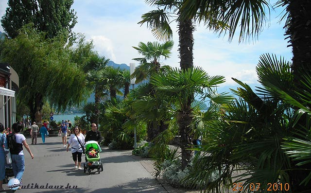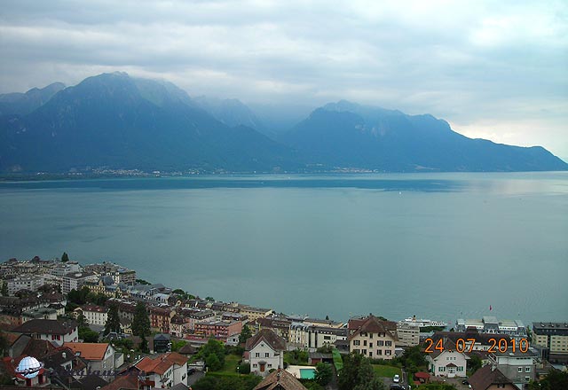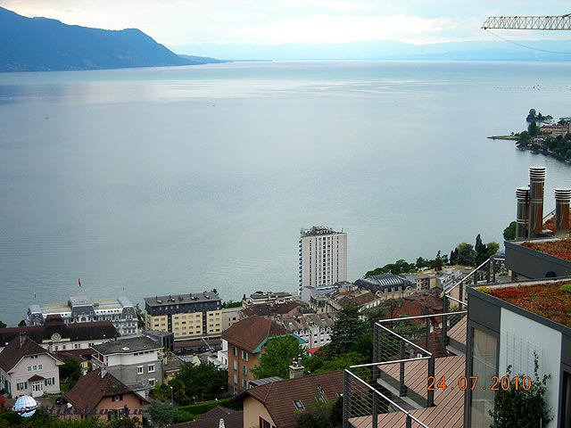A Genfi-tavat Montreux felől értük el, az autópálya közvetlenül a tó és a város felett halad. Gyönyörű volt a kilátás, megálltunk egy pihenőhelyen, ahonnét szépen ráláttunk Montreuxre, a tóra és a környező hegyekre.