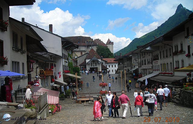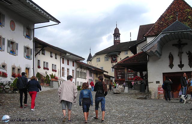 Csütörtökön borús napra ébredtünk, aznapra Gruyerest a világhírű hasonló nevű sajt szülőfaluját terveztük be. A falu egyetlen utcából áll, a házak a 15.- 17. századból származnak. Egy varázslatos, korabeli világba cseppentünk, de sajnos az időközben szakadni kezdő eső miatt nem tudtuk igazán élvezni a látványt. A falu végén saját termékeket, sajtokat lehet vásárolni, mi is vettünk Gruyeres sajtot, aminek az íze engem a parmezánra emlékeztetett.