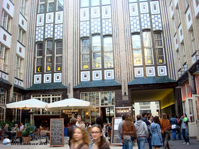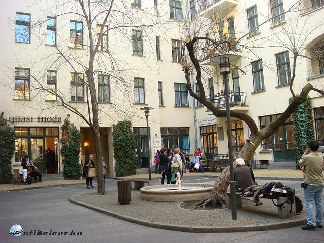 Sajnos beülni nem tudtunk sehová, mert dugig volt az összes hely. Így kezünkben egy pereccel és gusztusosan felaprított, kis műanyag tálkában kínált friss ananásszal sétáltunk tovább a Hackester Höfe-hez. Ez egy nyolc udvarból álló épületegyüttes 1905-07 között épült. Az épület stílusát tekintve a szecesszió és az Art déco keveréke, de fellelhetőek helyenként a Bauhaus stíluselemei is. Találunk itt mozit, színházat, galériákat, éttermeket, kávézókat, butikokat. Ami érdekesség még, hogy Wim Wenders a Távol és mégis közel c. filmmel tette ismerté az épületet az egész világgal.