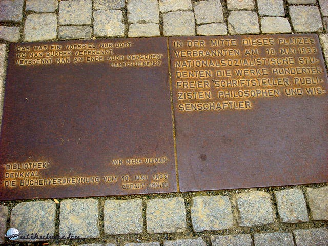 Potsdami túránk itt véget ért. Visszavittük a bicikliket, majd felültünk a SBahnra, hogy a Zoologischer Gartennél, átszálljunk a 100-as buszra, ahonnan a Staatoper (Állami Opera) mellett, a Bebelplatzon álló Könyvégetés emlékművét néztük meg. Az izraeli Micha Ullmann alkotása, az 1933. május 10-i könyvégetésnek állít emlékművet. Az egykori villamos alagútban lévő alkotás valójában egy 20 ezer kötetes könyvtár üres polcaiból áll. Egy üvegen keresztül nézhetjük az üres fehér polcokat.