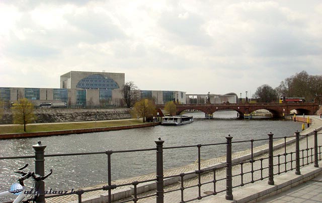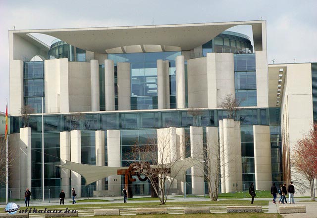 Kissé csalódottan továbbindultunk felfedezni a Reichstag körül nyugat és kelet felé szalagszerű elrendezésben elterülő, számtalan modern kormányzati és parlamenti épület alkotta Kormányzati negyedet. Az épületegyüttest „Band des Bundes” néven emlegetik, ami valami olyasmit jelent, hogy a „szövetség szalagja”. A terület északnyugati részén áll a szövetségi kancellária hivatal. Kockaalakja nyomán a városlakók „szövetségi” illetve „kancelláriai mosógépnek” nevezik. Az épület előtt álló, öt és fél méter magas fémszobor címe „Berlin”. Az egymásba kapcsolódó karok a német egységet jelzik.