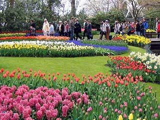 Keukenhof maga a paradicsom, évente mindössze kb. 2 hónapig van nyitva és több, mint 7 millió hagymát ültetnek el. Tulipán, jácint, nárcisz és örmény gyöngyike a fő növények a hatalmas fák és rododendron bokrok mellett. A virágillat fantasztikus. Vízesések, tó, kis dombok találhatók ebben a nagyon szépen kialakított kertben és mindenhol a színes virágözön. Sok padot is elhelyeztek, hogy az ember meg-meg tudjon pihenni, vannak éttermek és pavilonok is és egy szélmalom, mellette egy sajátságos szerszámmal faragták a facipőket. Egyetlen zavaró tényező van: a hömpölygő tömeg. Azt hiszem nagyon szerencsések voltunk, borzasztó nehéz kiválasztani a megfelelő pillanatot, de most a legtöbb virág nyílásban volt, alig volt olyan fajta, amelyik már túl volt a virágzás csúcsán és kezdett hervadni. De 2 nappal később bejött a meleg idő, szerintem a rákövetkező hétvégén már nem volt annyira tökéletes a virágpompa. Igazából április második fele a megfelelő látogatási idő, de ebben az évben annyira sokáig tartott a tél, hogy később nyíltak a virágok és a Keukenhof nyitvatartási idejét meg is hosszabbították május végéig.