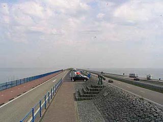 A nagy gát (Afluitsdijk) következett, ez a mintegy 30 km hosszú gát választja el a tengertől a Zuider zeet. Fantasztikus ez a gát, 5 év alatt építették fel. A gát közepén van egy pihenőhely, kilátóval és egy kis emlékművel, itt megálltunk mi is fotózni és egy szendvicset, kávét bekapni. Egyébként ezen a részen felhőkben jöttek a szúnyogok, apró bogarak, elég kellemetlen.