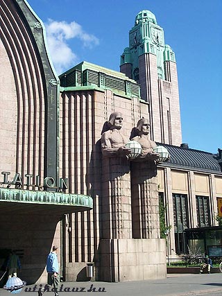 A finn oldalon Lahti síugró sáncainak képe – azóta már újakat építettek – ismerősnek tűnt, hisz a tévé közvetítéseit többször láttam. Aztán végre megérkeztünk Helsinki főpályaudvarára (jobbról). Maga az épület is híres, a XX. század elején Saarinen tervezte – a város egyik jellegzetessége a 48 m magas tornyával. Funkcionális, nagy épület, sokféle helyiséget foglal magába. Apa barátai vártak is minket, könnyen egymásra ismertünk. Nem volt könnyű kommunikálni, mert ők angolul és németül beszéltek, a feleségem franciául – én bár jártam német órára, de gyakorlatilag hiába. Ennek ellenére azért a verbális és non verbális eszközökkel egész jó kis beszélgetések voltak, sok mindent megtudtunk róluk, az országról, a finnekről, az ottani dolgokról. Ők nyáron a várostól nyugatra levő tóparti „nyári lakjukban” élnek, télen pedig a városi lakásukban. Ha már értünk be kellett jönniük, akkor felugrottunk a városi lakásba, amely jól tagolt és nagyon ésszerűen el- és berendezett volt. A lakás a mi fogalmaink szerint igen jómódúnak látszott, a családi étkészletek vitrines szekrényekben voltak – nekem szinte múzeumnak tűnt. A konyha fontos hely volt, sokféle praktikus gép segítette a háziasszony munkáját. Rövid idő múlva a nyári lak felé vettük az irányt, bár mi az első éjszakát a tóparti motelben töltöttük, mert vendéglátóinknál rák-parti volt. Jól is esett nyugodt helyen aludni a vonatozás után.