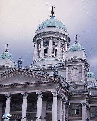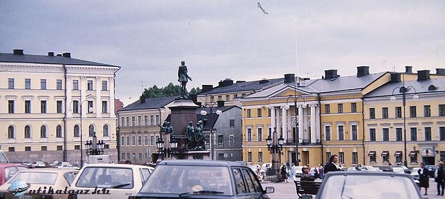 Másnap, a megbeszéltek szerint, magunk járhattuk be Helsinkit, amihez az útikönyv adott nagy segítséget. A Szenátus téren az evangélikus Nagytemplom (jobbról) lépcsősora előtt, a tér közepén áll II. Sándor cár, „Jó Sándor” szobra – ő adott az országnak részben önállóságot, a korábbi zivataros, többnyire svéd uralom után. A Nagytemplom klasszicista – mint a „régi” Helsinki szinte minden jelentős épülete –, monumentális méretei vannak, engem különösen belülről, a nagy fehér falfelületekkel, érthetően, a debreceni Nagytemplomra emlékeztet.