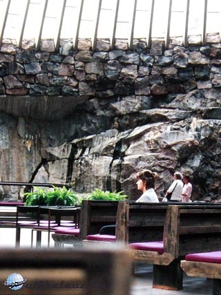 Nagy hatással volt rám viszont a Sziklatemplom. Ez a modern templomépítészet egyik jó példája, különleges teret hoztak létre a sziklába robbantott, nagyjából kör alakú központi templomtérrel. Eleve dombos részen van, a templomba lépve egy kis tér alá kerülünk, amely a bronzkupola és a föld(kő)felszín széle között üvegtetőn keresztül kap megvilágítást. A fal a durva, de csodálatos kemény kő, a berendezés csak a legszükségesebbekre terjed ki – oltár, úrasztala, padok, orgona – a világos fa színe dominál. Ezen kívül egy hangversenyzongora is volt még, amin valaki kellemes, csöndes jazz-zenét játszott, az áhítatot nem törte meg.