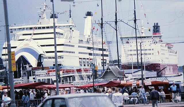 Helsinkiben a korábbi autós városnézéskor a kikötő felé is jártunk természetesen, a leglátványosabb része a Stockholmba közlekedő 6-8 emeletes komphajók dokkja – a Viking Line és a Silja Line társaságoké. Itt kérdezte vendéglátónk, hogy mentünk-e már ilyen hajóval – mi még addig csak a dunai és balatoni hajókkal utaztunk –, s hogy mit szólnánk egy stockholmi hajózáshoz. Mivel Svédországba még Finnország előtt megszűnt a vízumkényszer, így semmi akadálya nem volt. Ennek nagyon örült, és két nap múlva ünnepélyesen átadott nekünk két jegyet a Viking Line-ra (ezzel a céggel egyébként az IBUSZ-nak is valamilyen kapcsolata volt), ablakos kabinnal és svédasztalos vacsorával/reggelivel. Mondták, hogy a svédasztalos étkezés fantasztikus, de nem értettük, hogy annyit ehetünk, amennyit csak jólesik – az italért a csapvízen kívül kell csak külön fizetni. Igazából azt nem értettem, hogy egyszer lehet-e szedni, vagy többször is új tányérral lehet szedni – aztán a vacsora végére csak rájöttünk, így a reggelinél és hazafelé már hasznosítottuk az új „tudásunkat”. 1989-ben még itthon nem volt ilyen hely, főleg nem, ahol mi jártunk volna.
