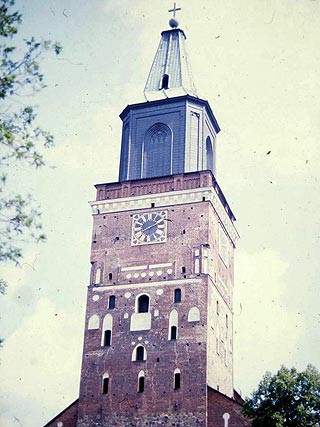 Turku, svéd nevén Abo (ejtsd: Obo) Helsinkitől 170 km-re, nyugatra van – inkább már a Botteni-öböl partján -, régen ez volt a főváros, a svéd uralom alatt jelentősége töretlen volt. Itt van a középkori Vár és Katedrális, a város környékén találhatók meg legnagyobb számban a régi korok építészeti emlékei, leginkább falusi templomai. Az időjárás nem fogadott a kegyeibe minket, hűvös, szeles és esős volt, így kívülről kevésbé nézelődtünk, a fényképezés után siettünk befelé. A Várban végigjártuk a kiállítást, de maga az épület jobban tetszett. A román és gótikus stílus jegyeit viselő háromhajós, szentélykörüljárós, kápolnakoszorús katedrális elbűvölt, méretével, magas tornyával, amin az egész története „olvasható” volt. A XIII. századtól a XVI-ig elkészült a teljes épület, a reformációval evangélikussá lett, s természetesen az évszázadok is megtépázták. Szép nagy orgonája is volt, és az egyik mellékhajó feletti karzaton jó kis kiállítást rendeztek be – a templomról és a történetéről, valamint egyházi kincsekből. A városban még a „Finn hattyú” nevű hajót néztük meg mint nevezetességet – egy kb. 100 éves vitorlás, amely mára iskola-, de szerintem inkább múzeumhajóvá vált.