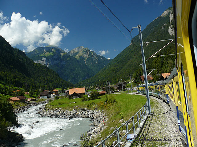 Autós utunk első megállójában felszálltunk a Meiringen-Innertkirchen vonatra. Az oda-vissza út alatt gyönyörködhettünk ennek az élményvasútnak köszönhetően a tájban. A vonat a folyó által a mészkőhegységben kivájt kanyon vonalát követi.