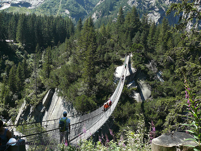 Tovább indultunk visszafelé, újabb megállónk Handegg volt. Itt van a Handeckfallbrücke. Ez egy 70 méter magas függőhíd. Az imbolygó hídról lenézve a mélységben hatalmas sziklákat és egy vízesést látunk.
