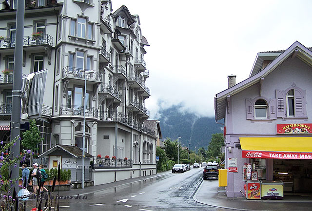 Interlakenben egy késői ebéd után az eső miatt csak egy rövidebb városnézés volt. A város egy turisztikai központ, sok szállodával és üzletekkel. A híres hegy, a Jungfrau közelében és két tó, a Thunersee és a Brienzersee között települ el.