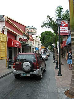 Az elsö hely ahova mentünk Philipsburg volt a holland rész fövárosa. A szálloda ablakábol is lehetett látni, de azért kocsival mentünk, és szinte 5 percbe került mig oda értünk. Bizony gyalog is mehettünk volna. A túristakalauz szerint 2 föútcája van, mi három párhuzamosat találtunk, melyekböl kettö szerencsére egyirányu volt. Es bizony igy is elég keskenynek tüntek, két kocsi elég bajosan fért volna el egymás mellett. Az összekötö utcák pedig még szükebbek voltak, nagy részük zárva a közuti forgalom részére.