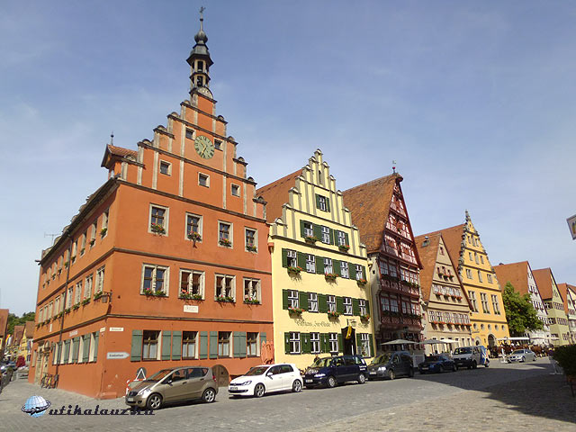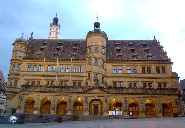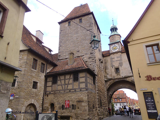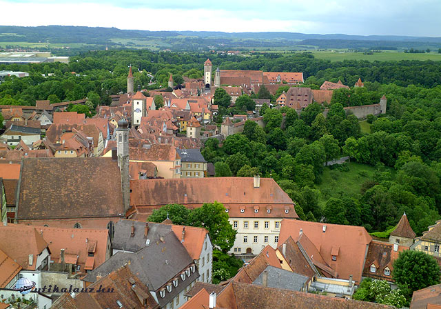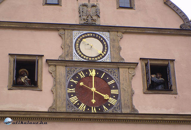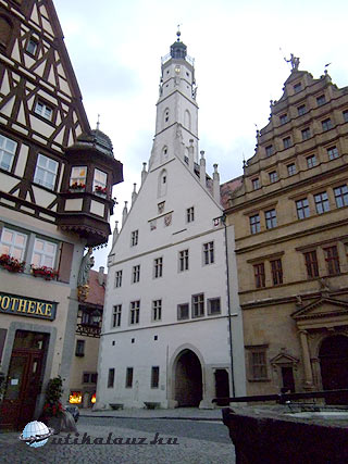 Dél körül érkeztünk Rothenburgba, mely az utazás fő célja volt. A középkori városfalakon kívül három nagy parkoló várja a turisták seregét, akik jönnek is a világ minden sarkából. Ausztráliából, Japánból, Kínából, az USA-ból, és Nyugat-Európa országaiból. Itt aztán virágzik a turistaipar, de ez a látnivalók értékéből semmit se von le. Nem véletlenül akarja látni a fél világ ezt a várost. A parkolás óránként 1 , egész napra 5 EUR. Rothenburg teljes egészében megőrizte középkori városképét. Teljesen ép városfalak, bástyák, kaputornyok, több száz éves házak, díszkutak, templom, városháza, szóval minden amit csak kívánni lehet. A városháza két részből áll. Egy újabb reneszánsz, és egy régebbi gótikus szárnyból. A kettő közt árkádos átjáró. 60 méter magas tornyába fel lehet menni. A panoráma miatt feltétlenül megéri. A város történetére rányomja bélyegét a harmincéves háború. A protestáns várost 1631-ben Tilly gróf seregei foglalták el. A kor szokása szerint ilyenkor a zsoldosoknak joguk van három nap szabadrabláshoz. Ilyenkor a lerészegedett, brutális katonák válogatott kínzásokkal, kegyetlenkedésekkel igyekeztek kiszedni a polgárokból értékeik rejtekhelyét. A nők sorsáról pedig jobb nem is beszélni. Nos, visszatérve a történethez, Tilly fogadott a polgármesterrel, Georg Nusch-sal, hogyha egy húzásra kiissza a borral teli, több, mint három literes serleget, akkor megkíméli a várost, lemond a három nap szabadrablásról. A zsoldosok nagy bánatára a polgármesternek sikerült a bravúr, erre emlékeztet a városháza melletti borozó ablakában elhelyezett óramű. Óránként kinyílik a két ablak, az egyikben Nusch polgármester issza ki a serleget, a másik ablakából Tilly gróf nézi álmélkodva a jeles tettet. A városban minden évben történelmi fesztivált tartanak, ahol korhű ruhákba öltözött zsoldosok szállják meg a várost, felvonulást tartanak, és a jeles borivást is eljátsszák. A fesztivált az idén május végén tartották. Mi erről most lemaradtunk, de sebaj. Legalább nem volt akkora tömeg. Egész estig jártuk a várost. Minden háza, minden utcája külön méltatást érdemelne, de ebből is kiemelném a Plönlein és a Márkus torony környékét. Aki teheti, látogasson el ide, megéri. Nekünk még közelebb is van, mint a japánoknak, akik pedig szép számmal vannak jelen a városban. Az üzletek kirakatában is három nyelvű a felirat: német, angol, és japán. Este élményekkel tele, de hullafáradtan értünk haza.