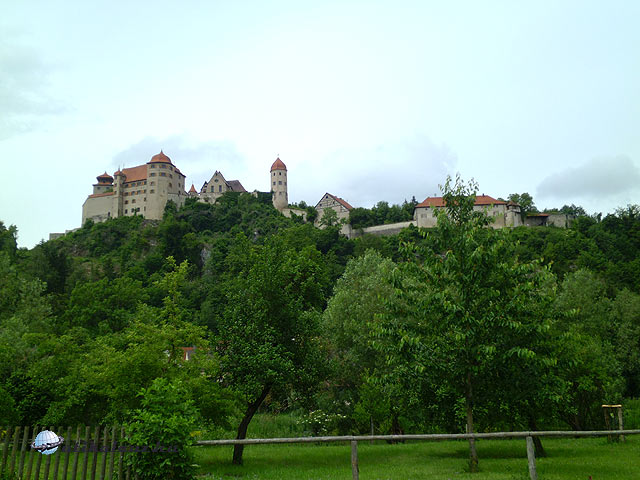 Pappenheimhez közel van Harburg vára. A Wörnitz partján, egy magas sziklán áll. Rendkívül dekoratív, fotogén vár. Magyar vonatkozása is van, ugyanis Luxemburgi Zsigmond adományozta az Oettingen grófoknak 1418-ban. 1634-ben Rákóczi György csapatai foglalták el, a fejedelem itt rendezte be a főhadiszállását. Az Oettingenek később házasság révén egyesülnek a Wallerstein grófi családdal, és hercegi rangot kapnak. Az idegenvezető hölgy ezt elég részletesen taglalta, a családfát is részletezte. Szerintem még mindig az Oettingen-Wallerstein hercegek a vár tulajdonosai. Az idegenvezető csak nekünk beszélt, mi voltunk az egyetlen látogatók. A belépő felnőtteknek 5, gyerekeknek 3 EUR. Sokkal jobban megéri, mint Pappenheim. Bejártuk az egész várat, nagyon tetszett minden. Várbörtön, lovagterem, várkápolna, kastély szárny, volt itt minden, ami csak egy várhoz kell. Végre egy vár, ami nem szálloda! Az Oettingen-Wallerstein hercegi család sörfőzéssel is foglalkozik. Saját márkás sörük a kitűnő „Fürst Wallerstein”, melyet csatos üvegben árulnak. Erről jut eszembe, hogy a boltokban szinte mindenhol csak üveges sört lehet kapni. Dobozosat alig láttunk, az is csak valami nevenincs, gagyi sör volt. Nem szennyezik a környezetet a sok sörösdobozzal, ezt az élményt meghagyják nekünk.