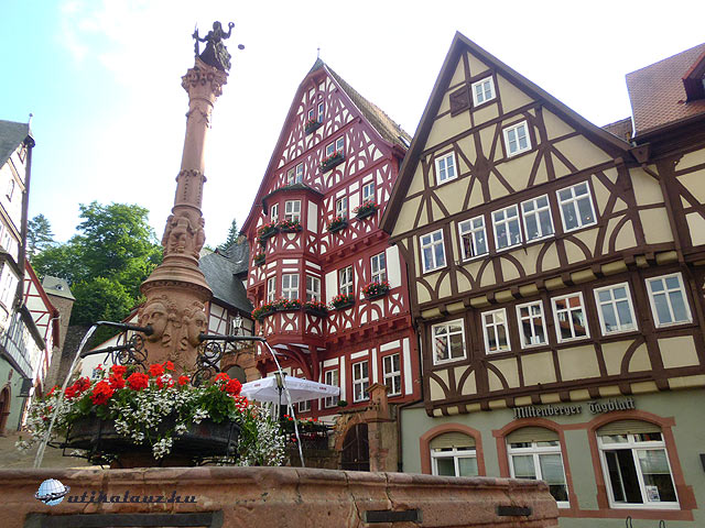 A mai nap utolsó állomása a közeli Miltenberg szintén Majna parti város. A folyó kanyarulatában, a Miltenburg vára alatt elterülő kisváros egy kis ékszerdoboz. Csak parkolóhelyet találni nehéz. Favázas házak közt sétálva jutunk el a bűbájos kis főtérig. Innen tíz perc séta a vár, amelyet már zárva találtunk, így csak kívülről néztük meg, majd visszatértünk a városba, ahol sétálgattunk még egy kicsit. A folyóparton ingyenes nyilvános WC található, melynek tisztasága sok hazai étterem mellékhelyiségét megszégyeníti. Hazafelé nem a würzburgi autópályán, hanem toronyiránt főutakon indultunk el. Kicsit lassabb a haladás, de szép az út. Érdemes figyelni az „UMLEITUNG” feliratú táblákat. Ezzel gyakran találkozni Németországban. Útelterelést jelent, és ha alatta egy minket érintő város neve látható, akkor kövessük rendületlenül a sárga táblákkal jelzett útirányt, ne hallgassunk a GPS-re, akármit is mond. Mi az utazás során kétszer futottunk ilyen Umleitungba, nem kell tőle megijedni.