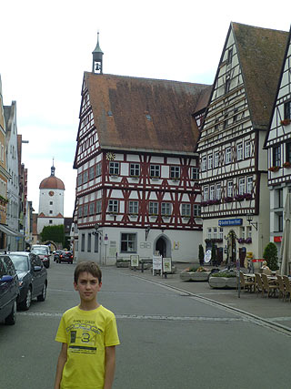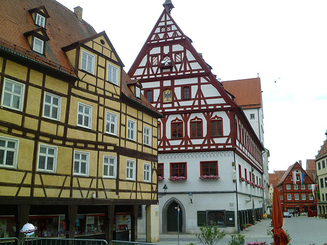Eléggé elszakadt az idő, mire Nördlingenbe értünk. Itt zajlott 1634-ben a harmincéves háború egyik jelentős ütközete, a nördlingeni csata. Itt sikerült először a császáriaknak legyőzni a svédeket. Nördlingen egy meteoritbecsapódás kráterének közepén helyezkedik el, és a várost mintha körzővel rajzolták volna. A kör alakú városfal és az öt városkapu teljes épségben fennmaradt. A löpsinger kapu mellett ingyenes parkoló található. Itt léptünk be az óvárosba. Nincs úgy kiglancolva, mint Rothenburg, turista is csak a töredéke az ottaninak, de jó hely. A legszebb épülete a városháza, és a Szt. György templom, amely az egyik legnagyobb késő gótikus német templom, gyönyörű hálóboltozattal. Tornya a 89 méter magas Dániel torony, látványa uralja az egész környéket. Valamelyik útibeszámolóban azt olvastam, hogy elég rozoga a lépcső, de ez nem igaz. Biztonságos, és stabil, csak borzasztóan magas, és fárasztó megmászni, de megéri. Egy kissé sietve néztük meg a várost, mert már későre járt, és az idő is elromlott. Majd még visszatérünk.