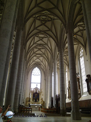 Ragyogó napsütésben indultunk el Dinkelsbühlbe. Az óváros szélén, a Rothenburgi kapu közelében parkoltunk le. A városfalak előtt megálltunk, mintha megállt volna az idő is… Egy csodálatos középkori város tárult a szemünk elé. Dinkelsbühl történetének legismertebb epizódja szintén a harmicéves háborúhoz kötődik. 1632-ben Gusztáv Adolf svéd csapatai foglalták el a várost. A polgárok gyermekekből álló küldöttséget menesztettek a svéd királyhoz, akik kikönyörögték a város számára a kegyelmet. Ennek emlékére minden évben megtartják a gyerekek felvonulásával egybekötött történelmi fesztivált (Kinderzeche). A várost tökéletes épségben megmaradt falak, bástyatornyok, és várárok veszi körül. Négy szép városkapuja a Rothengurgi, a Nördlingeni, a Wörnitzi, és a Segringeni kapu. Azt viszont tudnunk kell, hogy ezek az erős falak és bástyák soha semmilyen ellenségnek nem álltak ellen. Az első puskalövésre mindig feladták a várost, nem akarván felesleges ellenállással felbőszíteni a támadókat. (Nem úgy, mint a kőszegi polgárok.) Sikerült is nekik épségben megőrizni a városukat, az utókor szerencséjére. A Rothenburgi kapun léptünk be a csodás városkába, és szinte minden utcáját bejártuk. A főtéren áll a híres Szt. György templom. A késő gótikus stílusban épült csarnoktemplom belseje lenyűgöző. Sűrűn egymás mellett álló, karcsú oszlopnyalábok tartják a csodás hálóboltozatot. Fenséges, és lenyűgöző. A templomok közül eddig ez tetszett a legjobban. Megnéztük a házat, ahol Gusztáv Adolf megszállt, az Oroszlános kutat, a városházát, és a városkapukat. Kívülről is körbejártuk a városfalakat, majd ismét az óvárosi utcák következtek. Nehéz eldönteni, hogy melyik város a szebb: Rothenburg-e, avagy Dinkelsbühl. Aztán miként a boxmeccsen a bírók, 55-45 arányban mégiscsak Rothenburgot hoztuk ki győztesnek. Ide ugyan kevesebb turista jut el, mint Rothenburgba, kisebb a nyüzsgés, de talán ennek köszönhető, hogy Dinkelsbühl mégis megőrizte sajátos báját, egyedülálló hangulatát. Megtekintését erősen ajánlom mindenkinek.