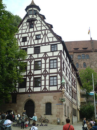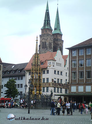 Csak szombat-vasárnap látogatható 14:00kor. Gondolom végigvezetik a látogatót az üres termeken, hisz nincs berendezve. Még pénztár sincs. Az udvarra viszont bárki bemehet. Megnéztük amit lehetett, majd továbbindultunk Nürnbergbe. A főpályaudvar közelében, az óváros szélén sikerült leparkolni. Nürnberg szép, és elég nagy város. Sok látogatóval. Itt már ázsiai turisták is megfordulnak. Sajnos a háborúban a kelleténél kicsit jobban megszórták bombával, lévén Nürnberg a Führer kedves városa, a birodalmi gyűlések székhelye. Nürnberg elég sok kárt szenvedett. Amit csak lehetett újjáépítettek, de sajnos a porig bombázott házak helyére modern épületeket húztak. Így hát nincs egységes városkép. Végigsétáltunk a König Strassén és máris a Szt. Lőrinc templomhoz érkeztünk, amely Nürnberg egyik fő látványossága. A szép gótikus templom mellett találjuk az „Erény kútját”, amely a XVI.sz. végén készült, és a Nassaui házat, amely a város legrégebbi polgárháza, egy gótikus lakótorony. A Pegnitz hídján átkelve máris a Frauenkirche előtt találtuk magunkat. A Miasszonyunk templom a város egyik jelképe. A főtér másik szembeötlő látványossága a dúsan aranyozott „Szép kút”. Mindent megcsodáltunk, majd átsétáltunk a Városháza térre, ahol a Szt. Szébaldusz templom áll. Nekem ez tetszett a legjobban a három közül. Innen már csak néhány lépés a Kaiserburg. A vár tövében találjuk Albrecht Dürer házát is. Megnéztük a várat, majd elvegyültünk a mulatozó tömegben, ugyanis épp akkor volt a Nürnbergi Sörfesztivál utolsó napja. Megkóstoltuk a híres kolbászt, és ittunk egy jó fekete sört. Mivel még vezetnem kellett, többet nem mertem.