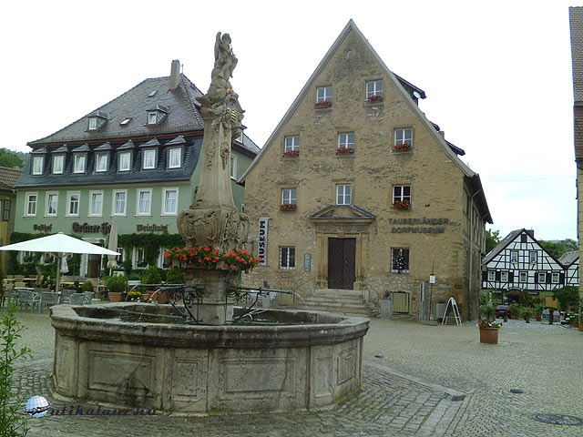 Hétfőn, mint tudjuk, a legtöbb kastély, vár és múzeum zárva tart. Nem így a közeli Weikersheim kastélya, amely a szomszédos Baden-Württemberg tartományban van, de mivel a határ közelében laktunk, igazán nem volt messze. Weikersheim kastélya nem szerepel egyik útikönyvben sem (legalábbis amelyikeket én lapozgattam), de ennek ellenére elsőrangú látványosság. Én egy utazási iroda prospektusában fedeztem fel. Szitáló esőben indultunk el, de mire megérkeztünk el is állt. Az óváros szélén, a kastély közelében ingyenes parkoló található. Városnézéssel kezdtük. Tetszett az óváros, csak annyi hibát találtam benne, hogy tele volt egy elvont szobrász torzszülött alakokat ábrázoló szobraival. Nem illett a városképbe. Még jó, hogy Fadrusz János nem láthatott ilyet életében, de ha most ezeket látná forogna a sírjában. Ennyit a modern művészetről. Weikersheim fő látványossága a barokk kastély, gyönyörű parkkal. Vezetéssel látogatható családi belépő 13.80 EUR. A „csoportban” rajtunk kívül csak egy német házaspár volt, így csak ötünket kalauzoltak végig a kastélyban. Nagyon tetszett minden, különösen a lovagterem. A kazettás mennyezet telis-tele csodás festett vadászjelenetekkel. Lenyűgöző látvány. Sajnos fotózni nem volt szabad, s mivel csak öten voltunk, még stikában sem tudtam fényképezni. Míg a termeket jártuk, odakint esett az eső, de mire végeztünk, el is állt. Így tehát a parkot is megtudtunk nézni. Érdemes.