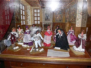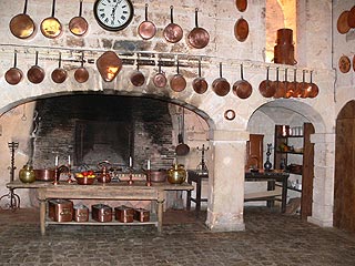 A rövid sétán megnéztük a hatalmas tánctermet az aranyozott mennyezettel, a szépen festett spalettákkal és az egész falat beborító gobelinekkel. A márki elvezetett bennünket egy különleges becsben tartott szobába, ahol egykor 13. Lajos is megszállt. Megnéztük a középkori konyhát, a pincét a borokkal, az ebédlőt, ahol a terített asztalon az étkészlet természetesen herendi volt.