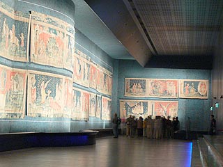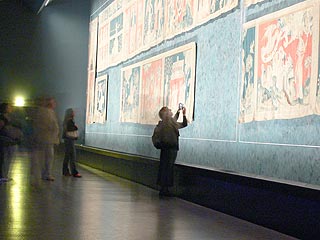 A hatalmas teremben nagyon halvány UV-fényes világítás van, hogy a szövetek ne sérüljenek és az esetleges kártékony dolgok is elpusztuljanak. A teremőrök azt mondták, vaku nélkül nyugodtan fényképezhetek, ha tudok. Kedvesen mosolyogtak hozzá. Mivel előre készültem erre a helyre, állványt is vittem, így talán valamennyire élvezhető felvételeket sikerült csinálnom.