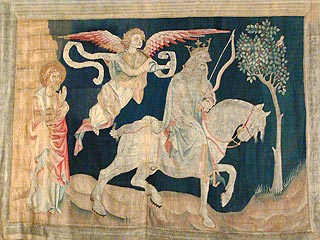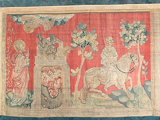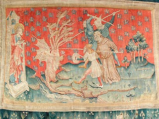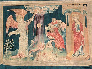 Amennyire az életet sugározza a föld feletti rész minden négyzetmétere, ennek éppen ellentétével találkozunk a várudvar alatt kialakított hatalmas kiállítócsarnokban, ahol Angers talán leféltettebb kincsét, egy több mint 600 éves faliszőnyeg sorozatot őriznek. A világörökség részének minősített gobelin darabjai a bibliai apokalipszist ábrázolják. Az eredetileg 144 méter hosszú, 90 jelenetből álló, egy darabban készült szőnyeget a forradalom idején feldarabolták, és részletekben eladták. Ma mégis közel egészben látható, mert a 19. század közepén visszavásároltak belőle 74 képet. A vörös és kék színeket használó gobelineken az apokaliptikus látomásokat a római hódítások korába helyezték, de akár a készítés idején ezen a környéken is zajló 100 éves háború véres ütközetei és a harcokat kísérő járványok, éhínség is közvetlen alapot adhatott a jelenetek tervezéséhez.