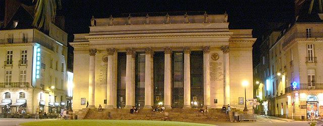 A klasszicista stílusú színházat 1788-ban építették egy teljes üres területre. A tér körül álló többi épülethez hasonlóan Mathurin Crucy tervezte. A színház előcsarnokban két oldalt Moliere és Racyn szobra áll – pontosabban ül. Műsort nem láttunk, de kalauzaink szerint opera, dráma, balett, musical sőt hip-hop műsor egyaránt van benne. Azt mondják, demokratizálni akarják a műsorokat is.