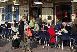 A széltől átlátszó fóliával védett, hősugárzókkal melegített kávéházi teraszokon ilyenkor is reggeltől estig nagyon sokan ücsörögtek, élvezték a szabadlevegőt. Mivel mi egyébként is a tél végéből jöttünk, nem lepődtünk meg a hőmérsékleten. No, meg kicsit szuggeráltuk is talán magunkat, hogy a megfelelő díszletek – pálmafák, turisták, tenger – oda képzeljük a mediterrán tavaszt. Ez néha egy-egy órára sikerült is, amikor kisütött a nap.