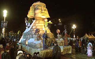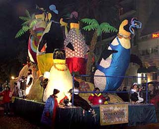 2005-ben a tébolyult éghajlat karneváli fenséget sok fantáziával jelenítették meg a kerekekre, kocsikra szerelt hatalmas makettek. Gyapjas zsiráfok szőrmebundában érkeztek, miközben Neptunus a csikóhalfogatos hajójával a kiszáradt tenger helyén maradt homokdombon száguldott. Egy másik élőkében a felmelegedés miatt tevévé alakult pingvineket láthattunk. Az elsivatogosodott Antarktiszt 2100-ban ábrázoló maketten szintén pingvineket láthattunk fürdőruhában sütkérezni, miközben a három királyok egy hajóval érkezetek. Egy másik karikaturista a klímaváltozás hatásaként síelő arab gyerekeket gondolt a szfinksz hátára eset hóra. A gazdag észak és a szegény dél ellentéte is megjelent az egyik képen. A 19-20. száza eleji stílusban megformált nagyhasú tőkés éppen szivarra gyújt az egyik gyárkémény tetején kijövő szikrával, miközben a déli szegények a nagy esőben esernyőik alatt húzódnak össze. Felvonult a télapó is, aki egy lakatlan szigeten üvegbúra alatt várta a jobb időket, a “nagy kékség” búvárát pedig a tenger helyet a szemét borította el. A szomorú végkifejletet ábrázolta az az élőkép, melyen a hatalmas Titán éppen az egész földet akarja elfogyasztani egyetlen falatként.