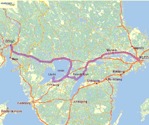 Elindultunk hazafelé. Az útirány Svédország, az Oslo-t Stockholmmal összekötő E18-as úton. Ez nem autópálya csak egy főút, de lehet rajta haladni. Még a határ előtt megállunk, Orje-nél, hogy elköltsük norvég koronánkat és együnk valamit. Amíg Galja vásárol, én kitanulmányozom az Oslo Stockholm busz menetrendet. Van naponta 4 busz kis vidéki porfészek.