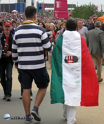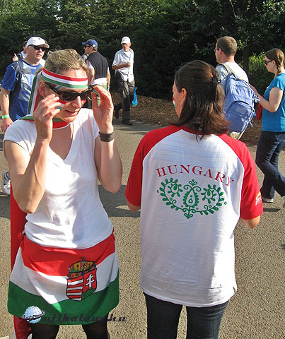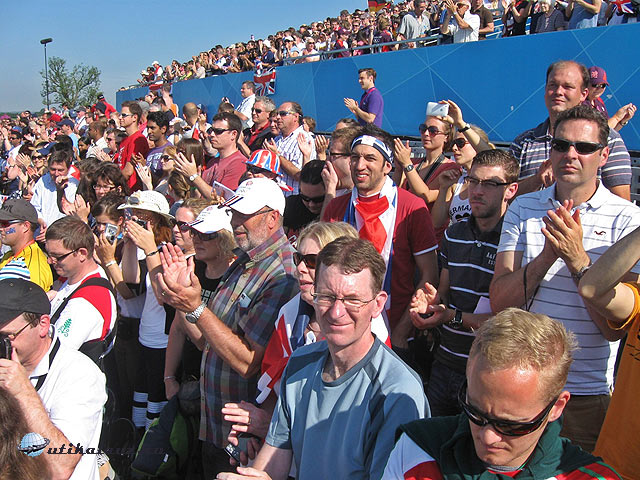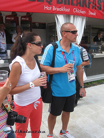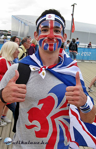 7. nap: Az utazás csúcspontja és a magyarok olimpiai szereplését megkoronázó nap nagyon korán indult, mert a 60 km-re Eton Dorney-ben lévő kajak-kenu döntők helyszínén legalább 1 órával a rajt előtt szerettem volna kint lenni. A Ramsay road-on lévő szállástól 4 átszállással megvalósult leggyorsabb utat a busz – metro – vonat – busz variáció kínálta Paddington állomásig. Onnan Slough-ba vonattal jutottunk ki. Eton-ba a versenypályára a 2-3 percenként járó “shuttle” buszoktól meg kellett tenni egy komolyabb gyalogutat. Külön érdekesség, hogy útközben az állig felfegyverkezett helyi rendőrökkel is készítettünk közös, mosolygós képet. Az olimpia rendezését segítő önkéntesek és biztonsági emberek közvetlennek, barátságosnak mutatkoztak, amint együttműködő és békés szándékunkat tapasztalták. A tribünök felé haladva bármerre néztem, mindenfelé magyarral találkoztam. A versenyek előtt beszédbe elegyedtem egy Londonban dolgozó, Debrecenből származó postással; egy kalocsai mintás pólót viselő – az előző napi szurkolástól berekedt – honfitársammal; néhány – zászlóikkal Jászalsószentgyörgyöt képviselő – nővel és magyar nemzeti színű pólót viselő borsodi emberrel.