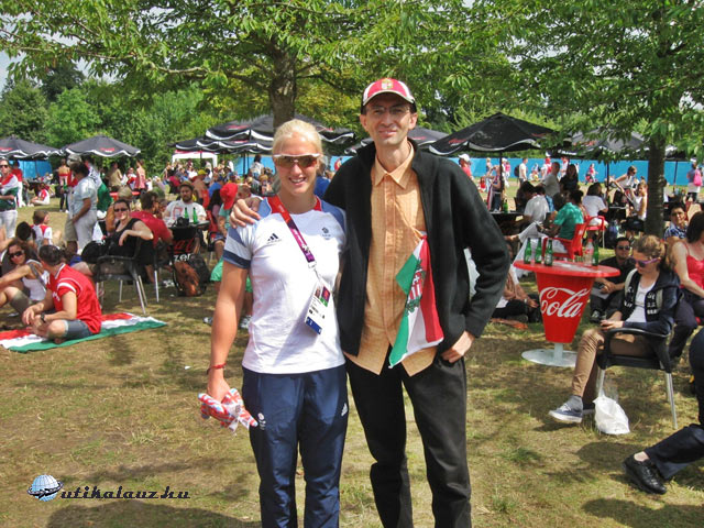 Utána elemeztük az eredményeket a szövetségi kapitánnyal, Storcz Botonddal, és figyelmesen hallgattuk értékeléseit. Az olimpia felhőtlen hangulatában beszédbe elegyedtünk a helyi kajakkirálynővel, Rachel Cawthorn-nal, aki legjobb angolként vehetett részt az olimpiai döntőben, és ott 6. helyen csapott célba. Közös fotónk újabb értékes emlékkel gazdagította olimpiai kirándulásomat.