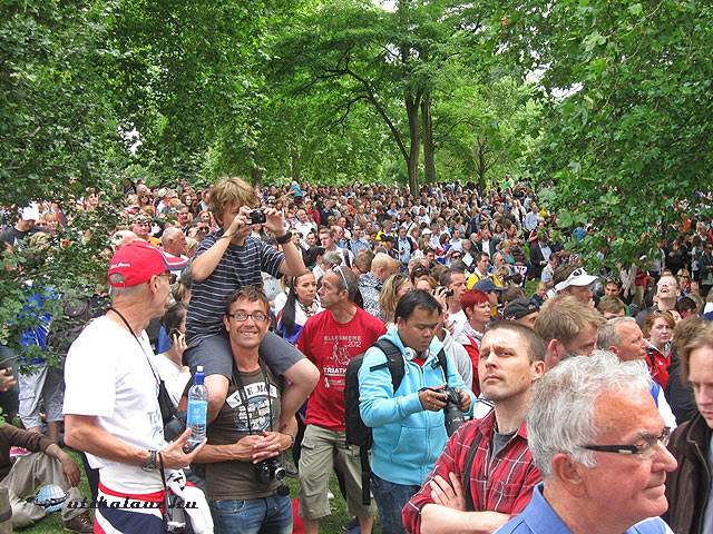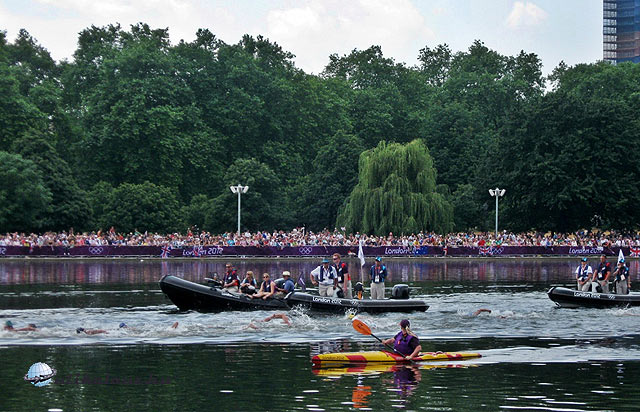 Jelenlévők ámulata közepette záródott a híd, ahonnan nyugat felé tekintve a 2. világháború legendás brit hadihajója, a Belfast cirkáló látható. Gyors metrózással átértem a Hyde parkba. A férfi triatlon olimpiai versenyeinek kerékpározását és futását tekintettem meg (több 10 000 sportrajongóval együtt). A kerékpározáson egy hosszú egyenes szakaszt egészen jól beláttam, a futás kanyargós pályája már kevésbé volt áttekinthető.