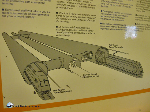 Calais-nál a Csalagút bejáratánál széleskörű biztonsági ellenőrzések keretében átvizsgálták mindenki csomagját. A velünk együtt utazó afrikai családnál ez hosszabb ideig tartott. Persze, aki látta azt a famíliát az nem is csodálkozott rajta (elég furcsa csapatot alkottak). Az út hosszához képest gyorsan átjutottunk a hatalmas víztömeg alatti alagútban, amely a La Manche csatorna francia és angol oldalát köti össze.