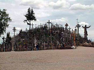 A Keresztek Hegye, ” .. ezen, az amúgy jelentéktelen dombon számtalan különböző nagyságú és anyagú kereszt (kb. 15000 nagyobb és 40000 kisebb) emelkedik az ég felé így is bizonyítva a litvánok mély vallásosságát. (A szovjethatalom kezdetekor 1200 keresztet számoltak össze). Ugyanakkor a pogány hit és a katolicizmus keveredését is jelképezi ez a hely, hiszen ahogyan a régi időkben, a kereszt állításával itt is misztikus áldozatot mutatnak be az emberek…” Ez későbbiekben titkos emlékhely volt, – melyet többször leromboltak -, a keresztek elhelyezésével emlékeztek meg a felkelések áldozatairól, az elhurcoltakról. Még 1977-ben is felmerült ennek megszüntetése egy duzzasztógát építése terveiben. A keresztek a szélben zörögnek, csilingelnek. Természetesen itt is van keresztje, vagy jelképtáblája más egyházaknak is, folyamatosan lehet hitet gyakorolni a közeli szabadtéri oltárnál, az ott tevékenykedő papoknál.
