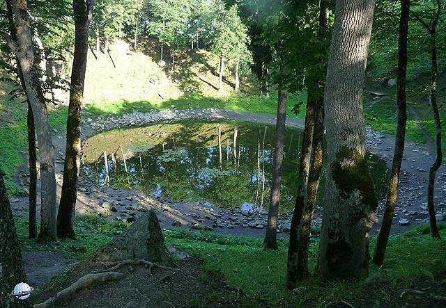 Kaali 18 kilométerre van Kuressaaretől Kuivastu felé vivő úttól 3 kilométerre északra. A táblák jól mutatják az utat. A laza településen nagy parkoló várja a látogatókat. A Kaali-keskus, vagyis hotel, múzeum, kávézó és információs központ várja az ideérkezőket. Végre megfejtettük a keskus szó rejtélyét. Központot jelent. Maga a falu is aranyos, de az igazi érdekessége a helynek, hogy erre a környékre meteor csapódott be 3000 évvel ezelőtt, kisebb-nagyobb krátereket hagyva maga után. Kilenc darab van belőle. A legnagyobb és leglátványosabb a kívül-belül durva mészkőből épült keskus mögött van. Fel kell sétálni a kráter peremére, máris megpillantjuk a lent meghúzódó tavacskát.