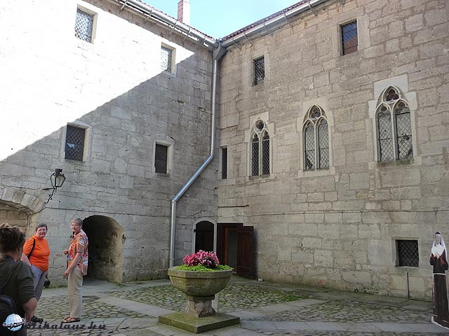 Akkor bukkantunk rá, amikor a dominikánus kolostort kerestük, melynek kerengőjében gótikus-reneszánsz kőtár van. Sajnos sehol sem találtuk meg a bejáratát, pedig nyitva kellett lennie a tájékoztatás szerint. A legígéretesebb kapu – bár ezen sem volt kiírás – zárva volt. Néhány utastársunk délután szerencsésebb volt, nyitva találta. A Péter-Pál templom mögött a Müürvahéből nyílik egy egyszerű bejárat, közel a Katalin közhöz. A Katalin köz macskaköves, a lábunk elé kell nézni. Érdemes feltekinteni a kéményekre, az egyiken bronz macska üldögél. Nézi a keskeny közbe kirakott asztaloknál a pizzaevőket. A valahai Katalin templom falán régi-régi sírkövek.