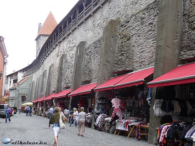 A felsőváros közelében álló Kiek in de Kök nevű bástyából indul naponta egy vezetett séta a városfal belsejében, de ide nem jutottunk be, mert csak korlátozott számú látogatót fogadnak, és már betelt a létszám. A bástyába magába fel lehet menni (csigalépcsők!) A város életéről látható benne kiállítás, pl., hogyan temették a pestises halottakat… Érdekesebb maga a bástya. Furcsa nevét onnan kapta (Kiek id de Kök pongyola németséggel “kukkants a konyhába”), hogy a katonák láthattak, mit főz a konyhában a háziasszony. Ha a konyhákba nem is lehetett belátni, mindenesetre jó magasan voltunk. A Viru-kapu közelében a Müürvahén árusok kínálják a kötött pulóvereket, sapkákat, szőtteseket.