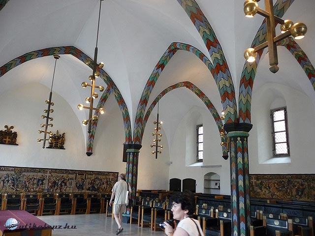 Belsejét számtalan címer díszíti. A Kardtestvérek nagymesterei, svéd és orosz tartományfőnökök fegyverekkel díszített sírfeliratait láthatjuk, összesen 107-et. A Dóm tornyába is fel lehet menni (50 korona), de ezt nem tartalmazta a Tallinn-kártya, különben sem tudtunk már csigalépcsőre nézni. Helyette kisétáltunk a Kohlu utcán a Toompea város fölötti kilátójára, ahonnan szabad kilátás nyílt a városra. Közvetlenül alattunk állt a Lühike jalg kaputornya, szemmagasságban nézhettük a szélkakast. Ha kihajoltunk a vastag falon, láthattuk, hogyan járnak ki-be a turisták.