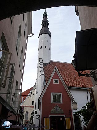 Akármerre indulunk is, eljutunk a főtérre, a Raekoja platsra. A tér közepén áll a középkori városháza, a Baltikum egyetlen megmaradt gótikus városházája. 1371 és 1407 között épült. Gótikus árkádsor jobb oldalán nyílik a bejárat. Aki a belső termeket is akarja látni, jó, ha július-augusztusban érkezik, mert ekkor látogatható, máskor koncerteket, zártkörű rendezvényeket tartanak benne. Legalsó szintje a borospince, felette a Vásár terem (itt tárolták az árut), felette a szépséges Polgárok terme. Felmehetünk egészen a fedélszék alá. A földszinten a városháza történetével foglalkozó kiállítás van, és itt látható Öreg Tamás is, a torony tetején lévő figura. A torony olyan magas, hogy alulról nehezen lehet kivenni a részleteket. Az első Tamás a Városi Múzeumban látható, a következő itt a földszinten, fenn a tornyon egy új Tamás pompázik. Fényképezni alulról szinte nem is lehet, csak valamelyik templom, vagy a Toompea kilátójáról teleobjektívvel. A magasban, a tető alatt hatalmas zöld sárkányok köpik a vizet – már ha esik az eső. Az árkádok alatt gitáros társaság tanyázott, van egy kis barátságos kávézó is. A falon látható az a nyakörv és négy vaskarika, amellyel a középkorban a bűnösöket a pellengérhez rögzítették. A Városháza mögötti kis utcában lévő volt városi börtön ma múzeum.