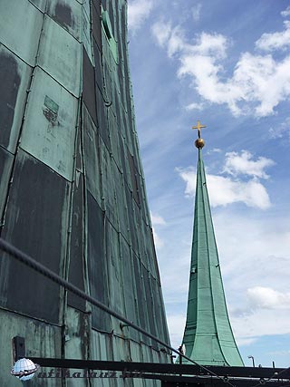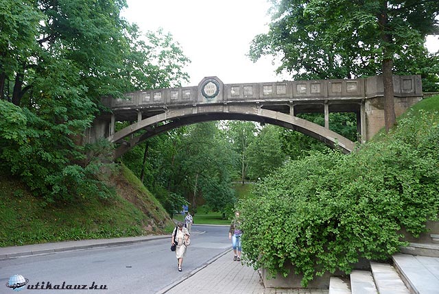 , a Szt Miklós (vagy Negoliste), a felsővárosban a Dóm és az ortodox Alexander Nyevszki. Az Olevistenek hihetetlen magas a tornya, pontosabban a toronysisakja. (jobbról) Sokáig ez a templom tartotta a magassági rekordot 159 méterrel, de leégett, és a helyreállítás óta csak 124 méter magas. A templom maga gótikusnak épült, de a nagy tűzvész után a XIX. században neogót stílusban átépítették. A mi sétánk során délután értünk a templomhoz, de nem mehettünk be, mert esküvőt tartottak. A toronyba azonban felkapaszkodhattunk. Szűk csigalépcsőn mentünk felfelé, csak felfelé, lógott a nyelvünk. A lépcsők magasak, szűkek, ha szembejövővel találkoztunk, a falhoz kell lapulni. Végre kibukkantunk a torony tetejére, ahol keskeny erkély vezet körbe. Ahol a fiatornyok vannak, alig fér el az ember. Ahol kiérünk az erkélyre, piros nyíl mutatja a haladási irányt, de mindig van néhány őrült, aki ellenkező irányba óhajtja kerülni. Az egymás melletti elhaladás nehézkes, kész tornamutatvány, mert a torony felőli oldalon meredeken ível fel a zöld bádogtető. A kilátás csodálatos, de nem hiszem, hogy szeretnék a közeljövőben csigalépcsőzni. Nem is tudom, mi a rosszabb: felfelé, vagy lefelé menni. A csigalépcsőknél fentről egy kötelet lógattak lefelé, ebbe kapaszkodtunk felfelé és lefelé jövetelkor egyaránt. Eleinte nem nyúltunk hozzá, de később ráfanyalodtunk, különösen lefelé jövet vettük nagy hasznát.