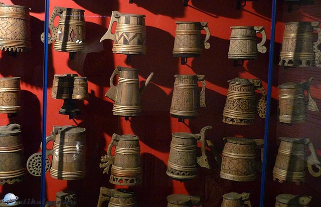 Sok szép dolgot láttunk, faragott sulykolókat, szőtteseket, szoba- és műhelyberendezéseket, viseleteket. Legjobban azonban a faragott söröskorsó-gyűjtemény tetszett. 3000 darab van a múzeum birtokában, a tárlóban csak töredékét állították ki.