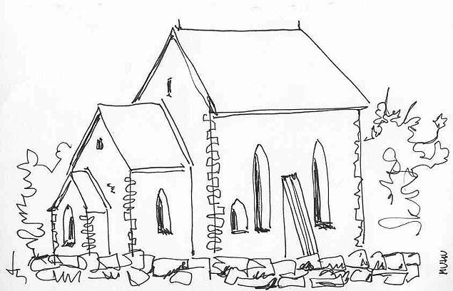 A komp előbb Muhu szigetére érkezett, ahol a kikötőben ugyanúgy nem volt semmi, mint Virtsuban. A busz kigördült a komp kinyitott orrán, és néhány perc múlva már le is kanyarodtunk a főútról, mert megérkeztünk Liiva faluba, ahol egy bűbájos torony nélküli templomocska állt a falu közepén. A templomot ma is használják, 1972-ben tatarozták, viszonylag jó állapotban van. Belsejében falfestmény maradványok, melyeket a “Gotlandi mester” készített.