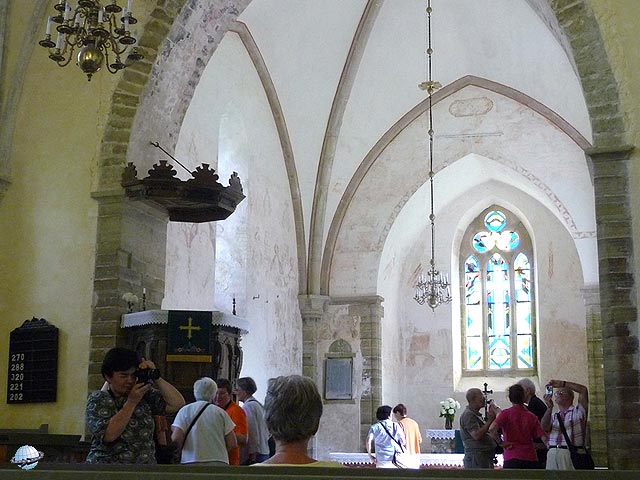 Itt látható az első írásos kőtábla a karzat alatt. A szószék mellett festett faszobor, szintén a legrégebbi nyugat-észtországi szigeteken. A saaremaai templomokról sehol nem találtunk ismertető anyagot. A tallinni információs pontnál sikerült egy kis füzetet begyűjtenem a saaremaai templomokról, igaz, ez a bennük tartott komolyzenei reklámozta, mindenesetre Kaarma és Karja templomáról bővebben olvashattunk észt, finn és angol nyelven. Jóval több információt találtunk az észt templomokról készült 2010-es kiadványban. Területi felosztásban tartalmazza a templomok listáját, a közepén térkép, minden templom bejelölve, a száma alapján kikereshető a listában. Rövid leírást tartalmaz észt és angol nyelven, mellette fénykép, a nyitvatartási idő, az istentiszteletek, misék időpontja és telefonszám. Nagyon használható kis füzet! Az ingyenes kiadványt minden működő, azaz felszentelt templomban megtaláltuk.