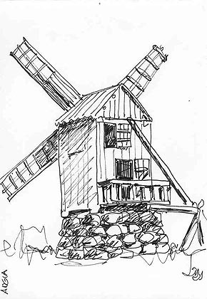 A szélmalmok kicsik, forgathatók a szélnek megfelelően. Nagy rúd támasztja ki (vagy rögzíti?) Van holland típusú is, nagy gombakalappal. Mindegyikbe be lehet menni, megnézni az őrlőszerkezetet. A nagy szélmalomban zsákvászonból készült kitömött bábuk színesítik a bemutatót. Van molnár, tejet ivó gyerekek, öregasszony, még egy egér is. Ezeket nem tudtuk lefényképezni, mert éppen lemerült a fényképezőgép akkumulátora.