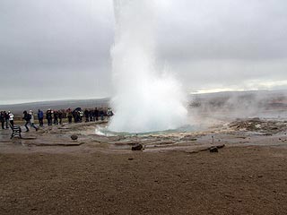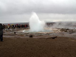 Nem javult az idő, sőt egyre jobban zuhogott az eső, hideg volt, erősen fújt a szél, amikor a Haukadalur völgybe értünk, ahol utunk egyik legérdekesebb látnivalója várt: elérkeztünk a gejzírek vidékére. A legrégebbi feljegyzések a Haukadalurnál lévő gejzírről 1294-ből valók. A gyakori földrengések jelentős változásokat és több új, forró vizű forrást hoznak létre ezen a vidéken. A Gejzír és a környező gejzírek aktivitása szorosan összefügg a földrengésekkel. A rekord számú gejzírt 1630-ben jegyezték fel, amikor a földrengés olyan erős volt, hogy az egész völgy rengett. A névadó Gejzír ma már nem is működik, bár azt mondják, hogy évente egyszer megmutatja, hogy ő a főnök, mert alkalmanként akár 60 méter magasra is fellövelli a forró vizet.