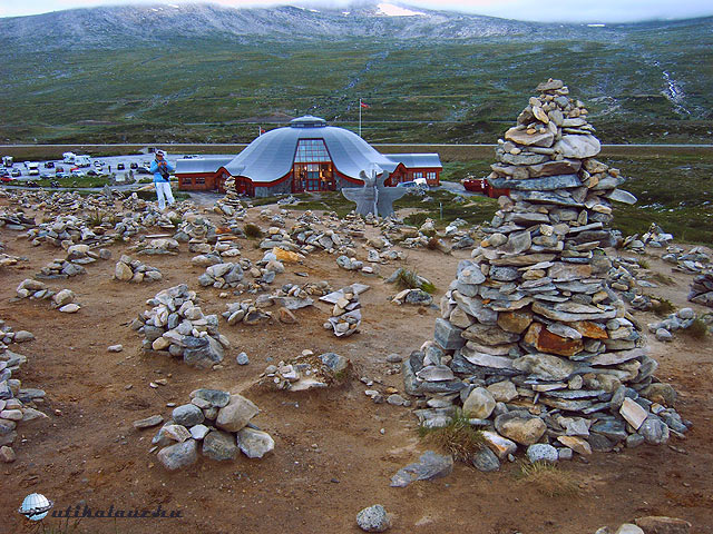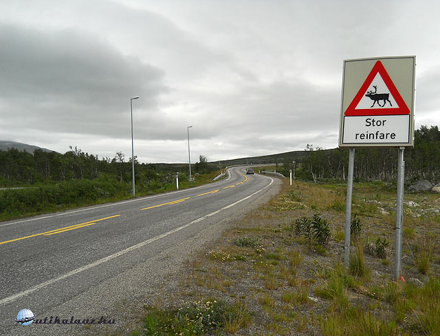 Váratlanul eltávolodunk a fjordoktól és egy 550 m magas platóra érkezünk. A táj teljesen megváltozik. Kopár, mohával, zuzmóval borított sziklás tájat itt-ott bokrok, cserjék tarkítják. A hőmérséklet 4-5 fokra csökken. Ez már a tundra. Az eső elállt, ködös szürkeség vesz körül. Forgalommal alig találkozunk, az útmenti tábla figyelmeztet: “vigyázat rénszarvas”.