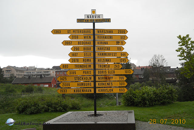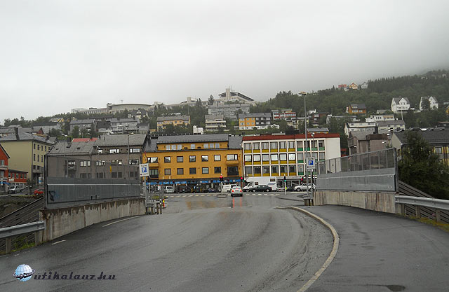 Szitáló esőfüggönyben hajtunk be Narvikba. Átmegyünk egy hosszú hídon a fjord egyik ága felett. A szürkeségben is jól kivehetők a várost övező hófödte 1800 méteres hegyek, melyeket az alacsonyabb régiókban a juhar és kőris mellett főleg fenyőerdők borítanak. A Frostisen gleccsernyelv szinte a város házaiig nyúlik le. Télen a vastag hótakaróban itt található a kivilágított, felvonókkal ellátott nevezetes síparadicsom. Egy emelkedő után feltűnik a város jellegzetes házaival. Jól kivehető a négyzetes utcahálózat, melyet a főutca ural, amit szoros egymás melletti 2-3 emeletes épületek, üzletek, bankok, irodák foglalnak el. A centrumban egy nagyobb tér a Quo Vadis táblával, melynek szélén több irányból érkező lámpákkal ellátott kereszteződés található. Pár percnyi járásra a járda melletti tank makett jelzi, hogy itt van a város nevezetes, a második világháborús történeti múzeuma. Annak idején, a stratégiai fontosságú városért emlékezetes csaták zajlottak le, úgy a szárazföldön, mint az elaknásított fjord vizein. A kis város többször is gazdát váltott, a mai napig a fjord fenekén számos korabeli roncs található.